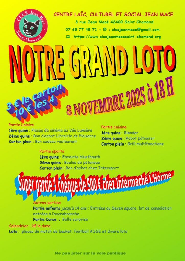 Le samedi 8 novembre 2025 prochain aura lieu notre loto annuel au siège 3 rue Jean Macé à Saint-Chamond.