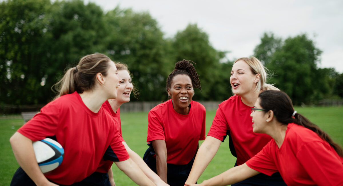 Female rugby players stacking their hands together
