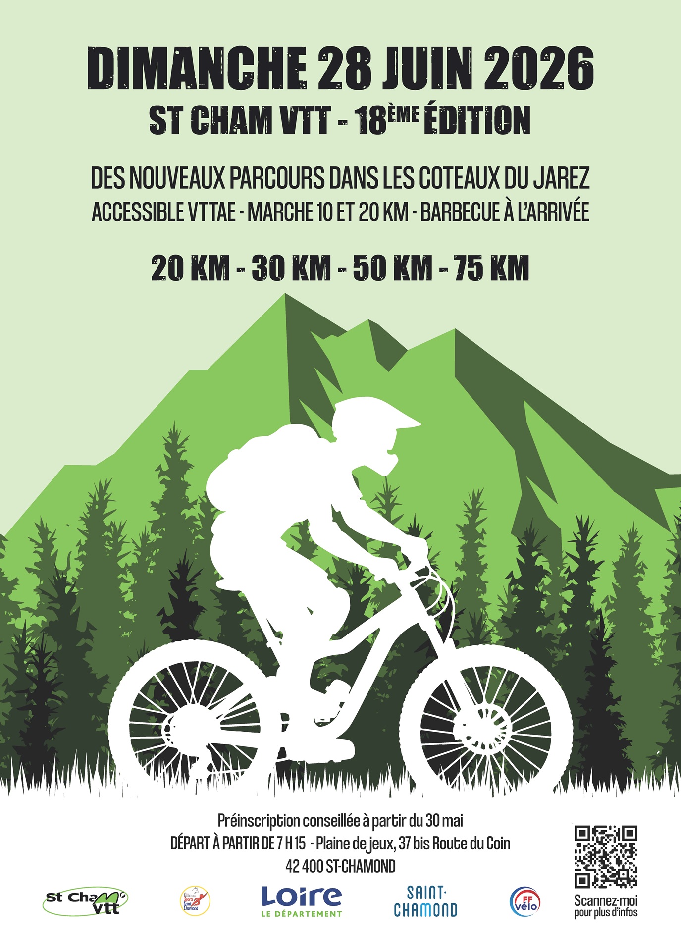 La St Cham VTT revient pour une 18ème randonnée, avec 5 nouveaux parcours VTT de 20 à 70 km entre Pilat et coteaux du Jarez et 2 parcours marche.